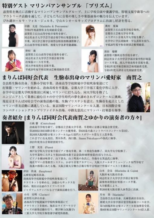 今回は滋賀で活躍されるマリンバ奏者をお招きしたマリンバアンサンブルのステージもあります。